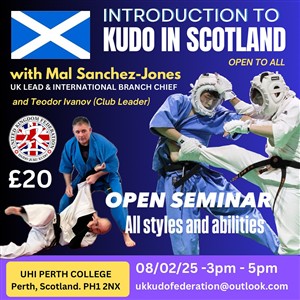 INTRODUCTION TO KUDO IN SCOTLAND SCOTLAND OPEN SEMINAR: An introduction to KUDO - Japanese Combat SportJoin us in Perth, Scotland for the first-ever KUDO MMA seminar! Open to all levels and styles. Learn from Mal Sanchez-Jones & Teodor Ivanov!